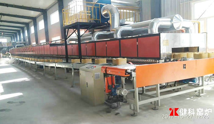 輥道窯的燃燒室在輥?zhàn)拥南路剑脡嚎s空氣霧化重油、柴油、煤油等燃料進(jìn)行燃燒。也有用煤氣發(fā)生爐所產(chǎn)煤氣進(jìn)行燃燒的,比較大型的陶瓷廠大都采用雙段冷煤氣站,使用冷靜煤氣進(jìn)行燃燒,產(chǎn)生高溫。燃燒室與輥道之間,有耐火材料隔離,火焰不直接接觸被燒制的產(chǎn)品。相對(duì)來(lái)說(shuō),煤氣發(fā)生爐配套輥道窯燃燒比重油、柴油等成本低,比直接燃煤效率高環(huán)保達(dá)標(biāo)。使用重油為燃料時(shí),為防止煙氣污染制品,要采取隔焰或半隔焰形式。電熱時(shí),為保護(hù)發(fā)熱體或使溫度更均勻,也需將發(fā)熱體和制品隔開。